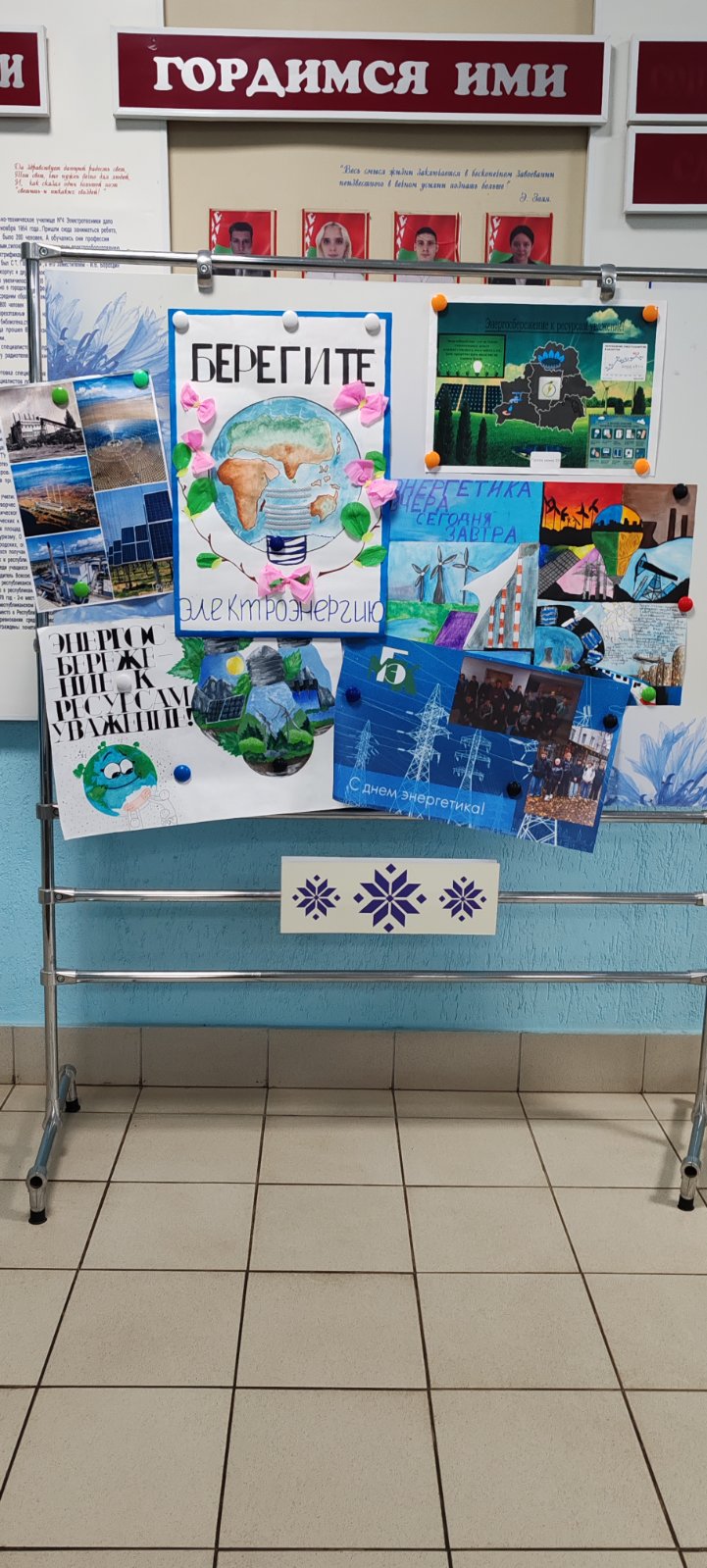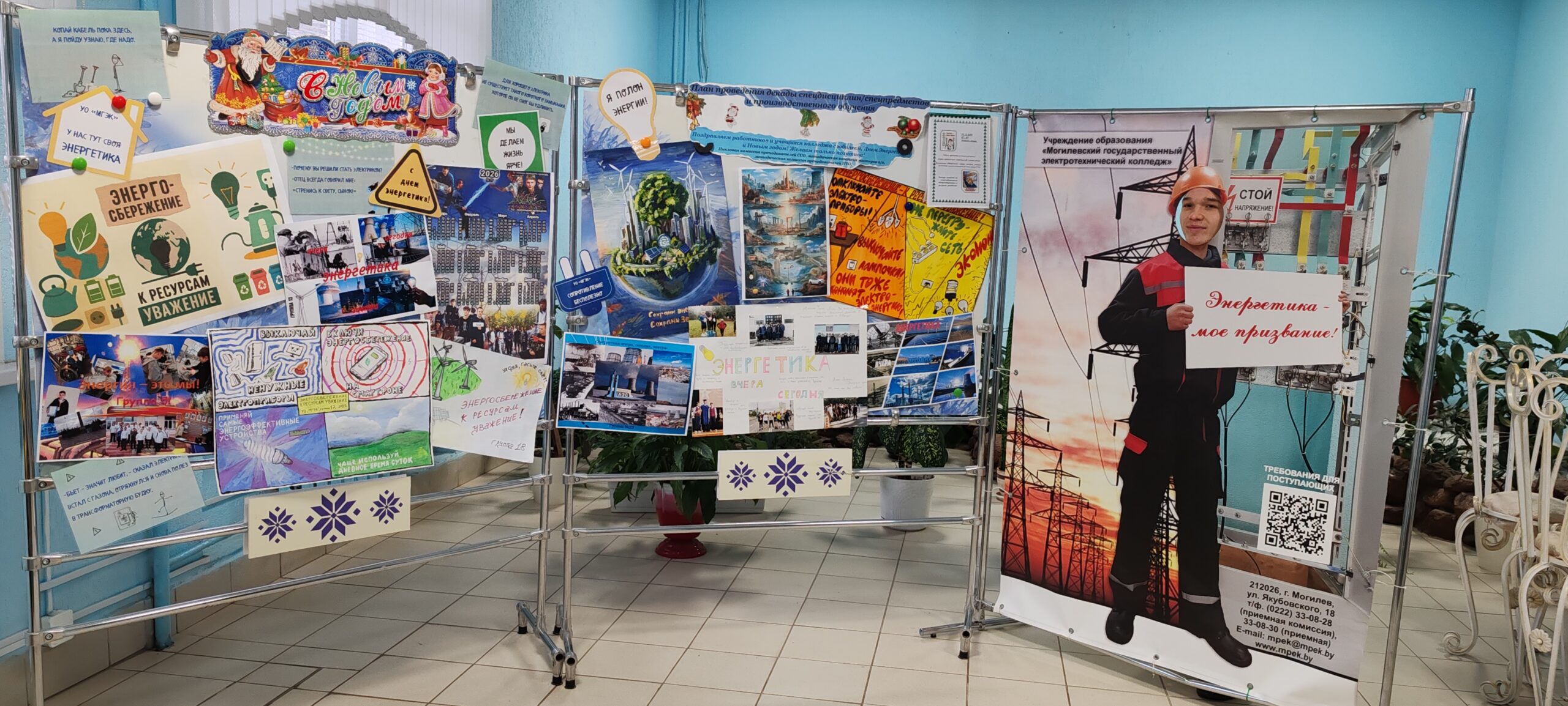 В фойе корпуса №1 оформлен демонстрационный стенд с творческими работами учащихся 1 и 2 курсов – конкурс плакатов по энергосбережению «Энергосбережение – к ресурсам уважение» и фотоколлаж «Энергетика – вчера, сегодня, завтра», ежедневно на мониторе включается и работает видеоролик-анонс с презентацией запланированных мероприятий.