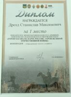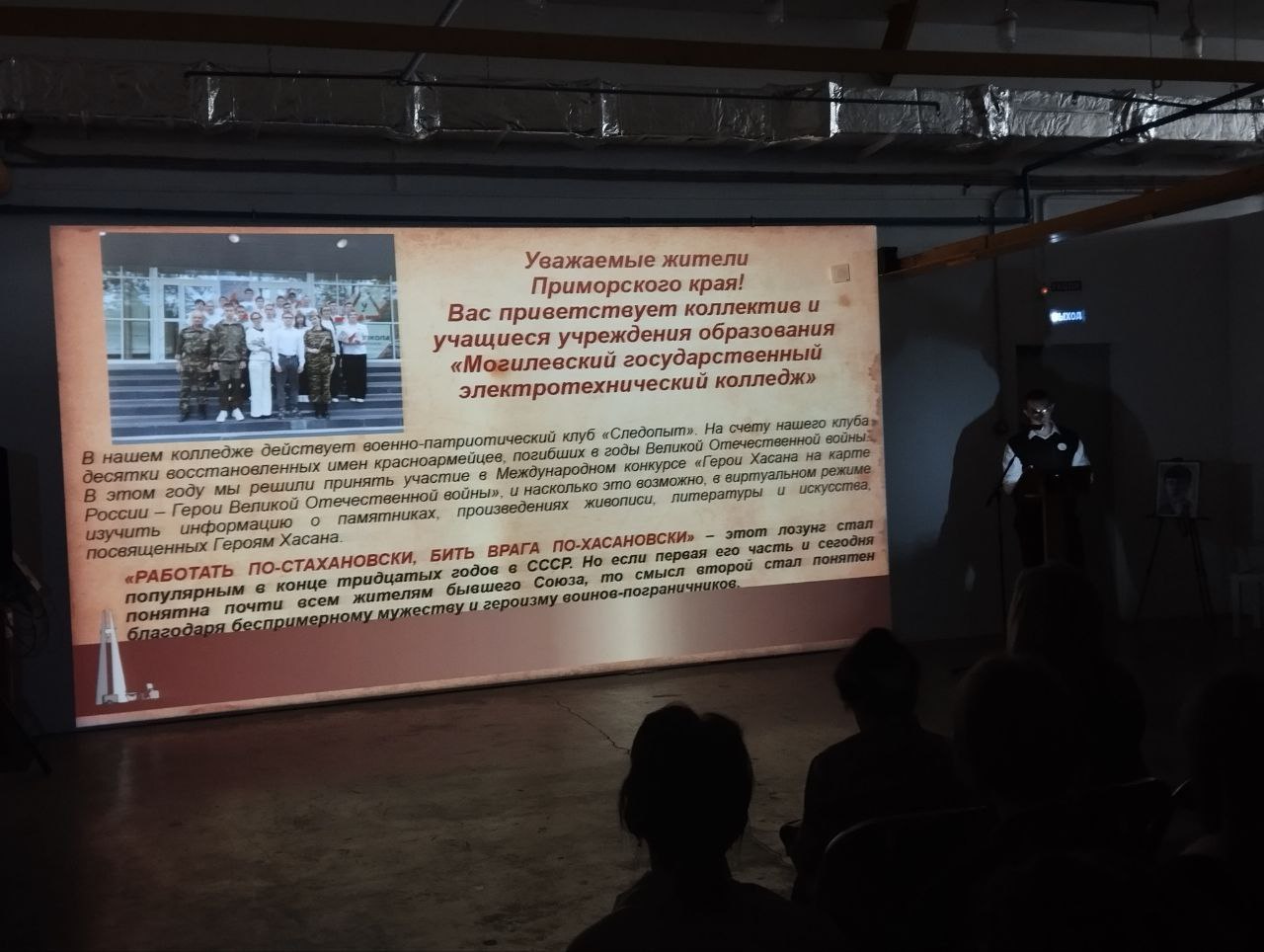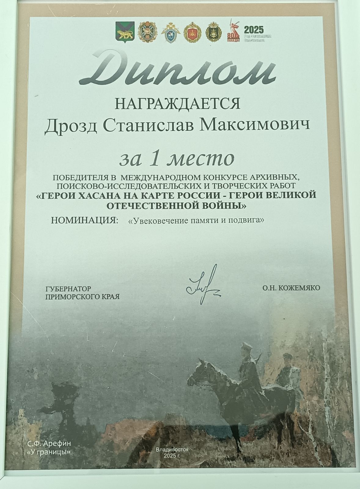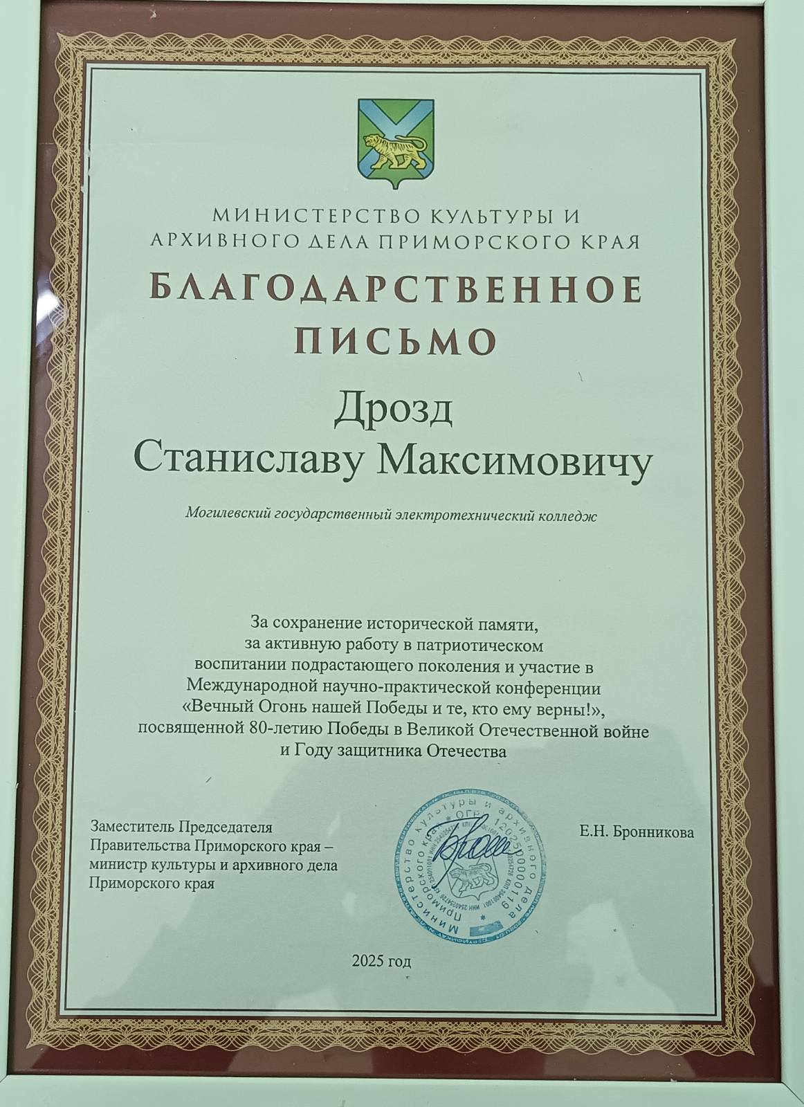 В период с 18 по 20 сентября 2025 года в Приморском крае (г. Владивосток) состоялись торжественные мероприятия по подведению итогов Международного конкурса архивных, поисково-исследовательских и творческих работ «Герои Хасана на карте России — Герои Великой Отечественной войны». В торжественных мероприятиях приняли участие методист колледжа Кавцевич М.Г. и учащийся группы № 8 Дрозд Станислав. Так, по итогам конкурса Станислав стал победителем и награжден Дипломом 1 степени в Правительстве Приморского края.