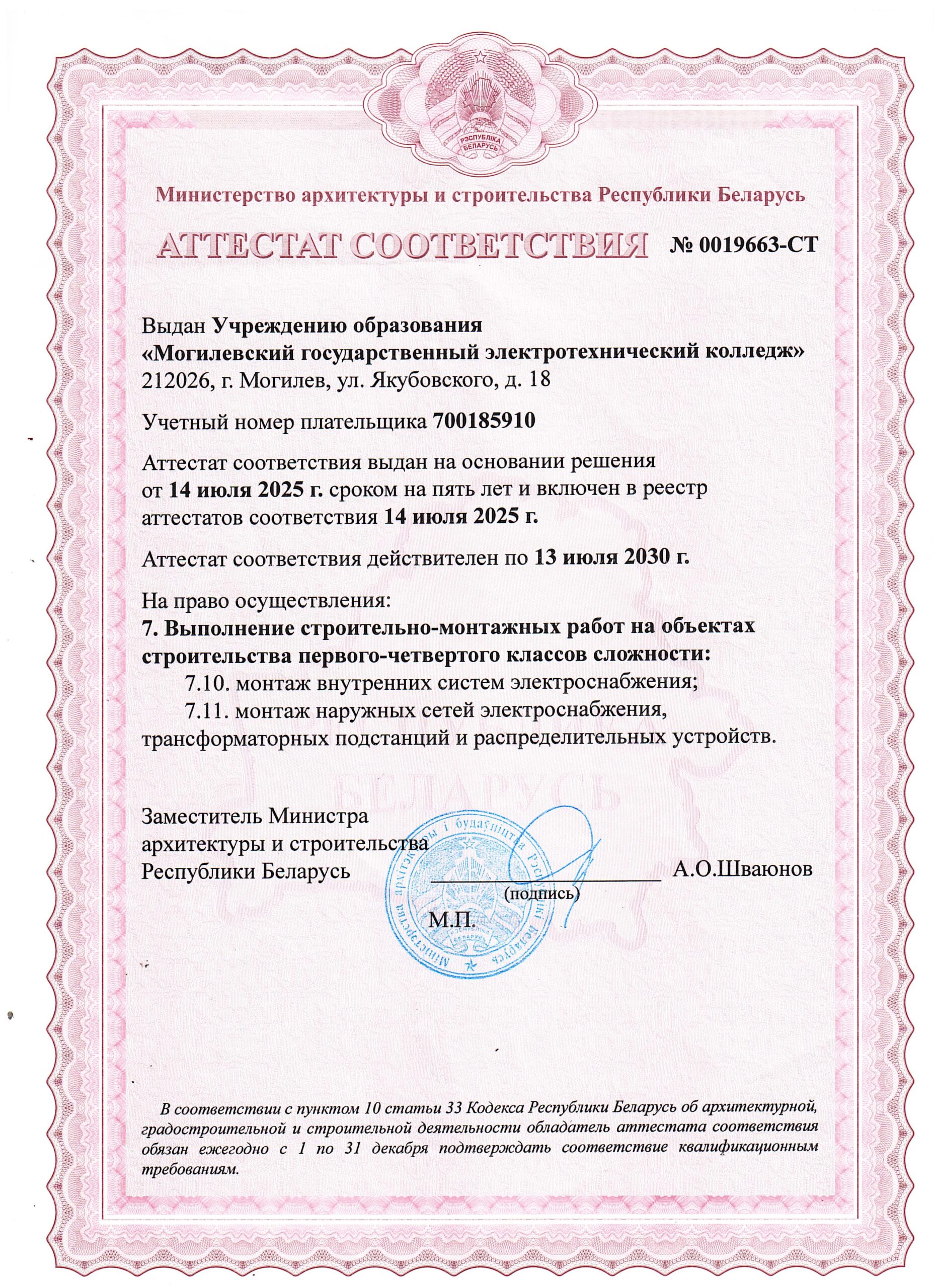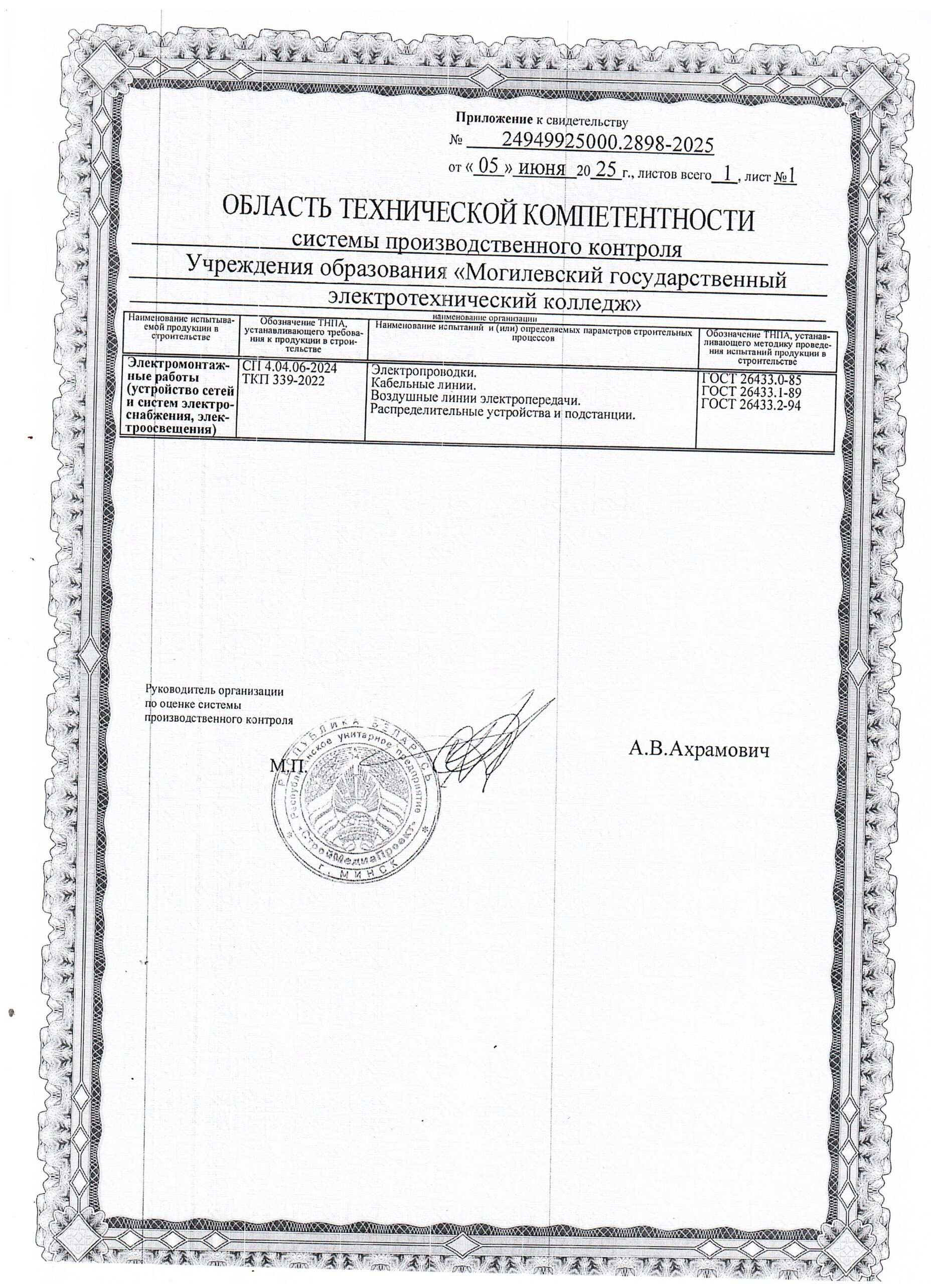 За период работы (с 2002 года) учреждение образования «Могилевский государственный электротехнический колледж» выполнил электромонтажные работы более чем на 120 объектах. В работе соблюдаем правила пожарной безопасности и руководствуемся требованиями ТКП, ПУЭ, ГОСТ, СНиП. В штате нашего колледжа только умелые, ответственные мастера производственного обучения с опытом работы. У каждого из них есть профильное образование и все необходимые допуски. ПРОФЕССИОНАЛИЗМ НАШИХ СОТРУДНИКОВ – ДОПОЛНИТЕЛЬНАЯ ГАРАНТИЯ ВЫСОКОГО КАЧЕСТВА УСЛУГ.