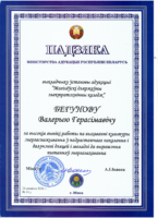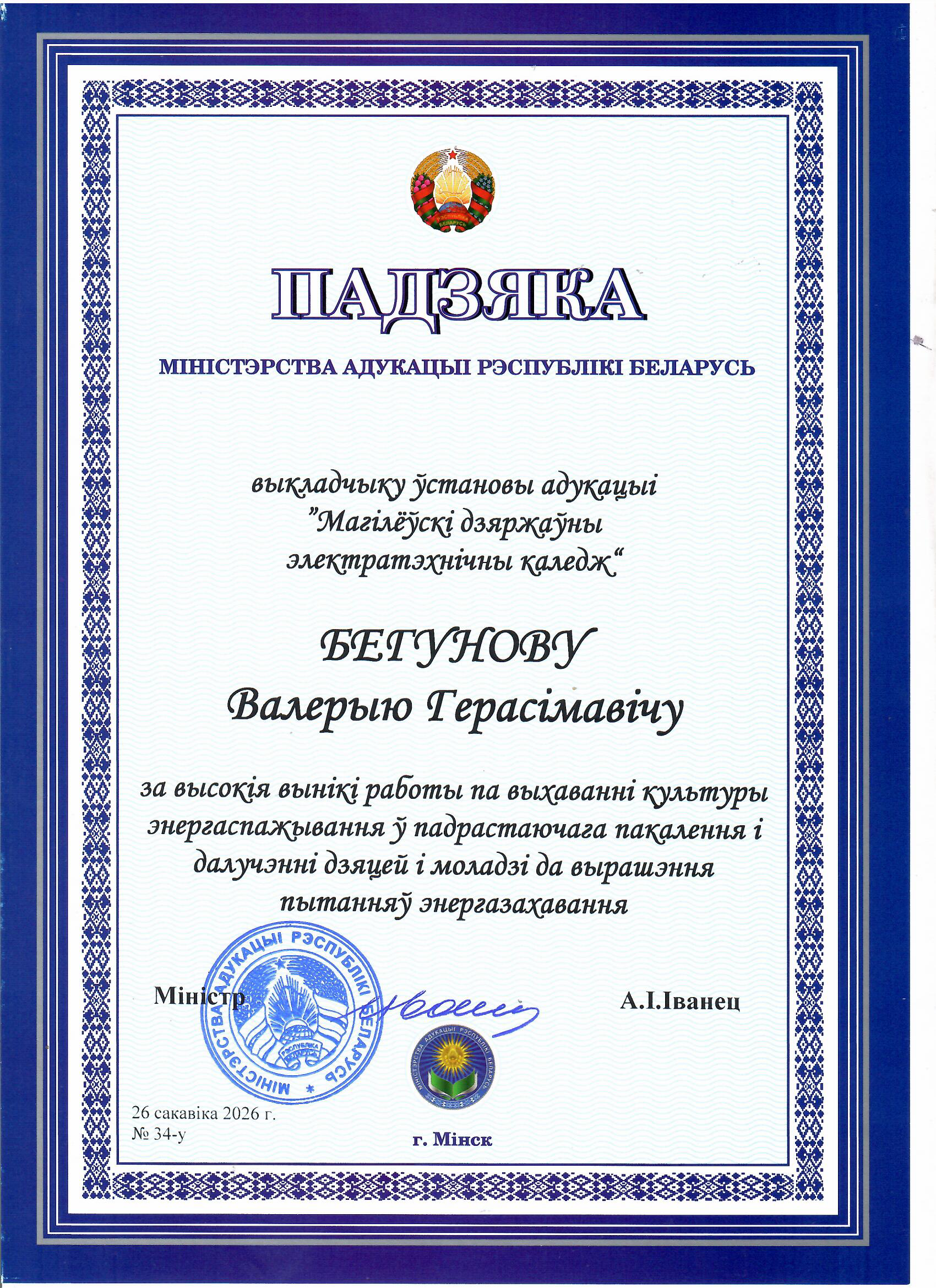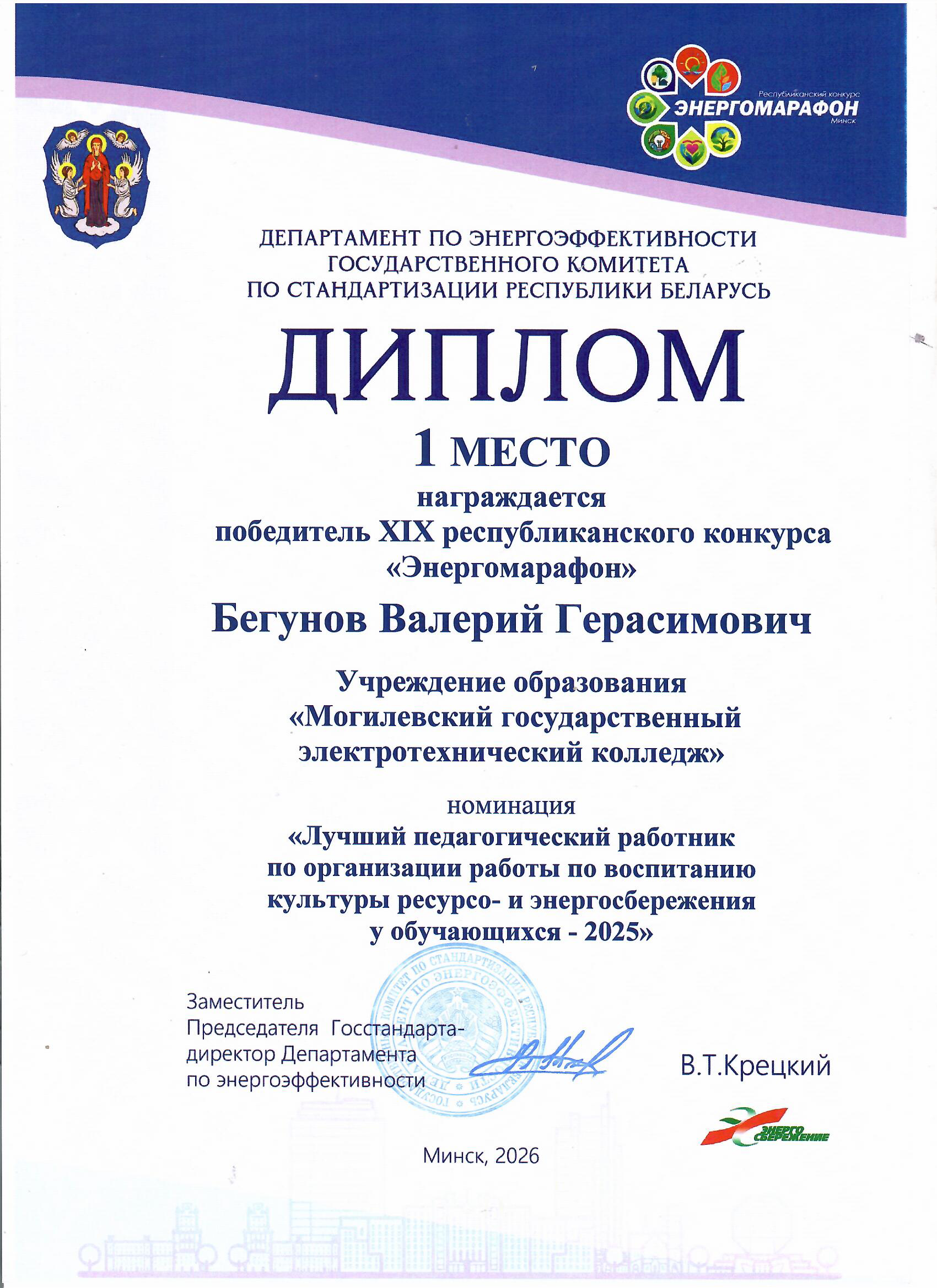 В номинации «Лучший педагогический работник (преподаватель) по организации работы по воспитанию культуры ресурсо- и энергосбережения у обучающихся» дипломом I степениБегунов Валерий Герасимович. Также Валерий Герасимович удостоен благодарности Министерства образования Республики Беларусь.