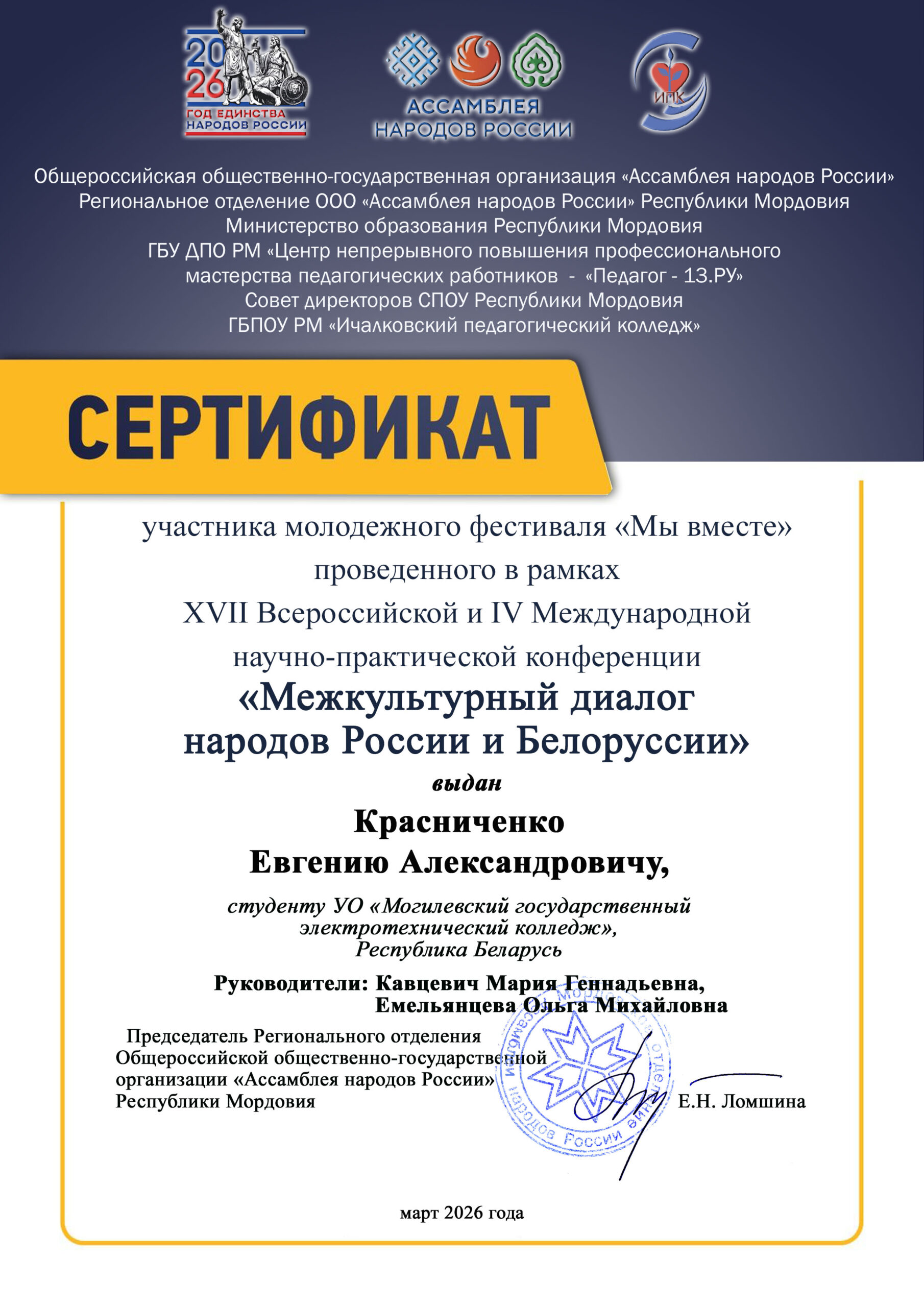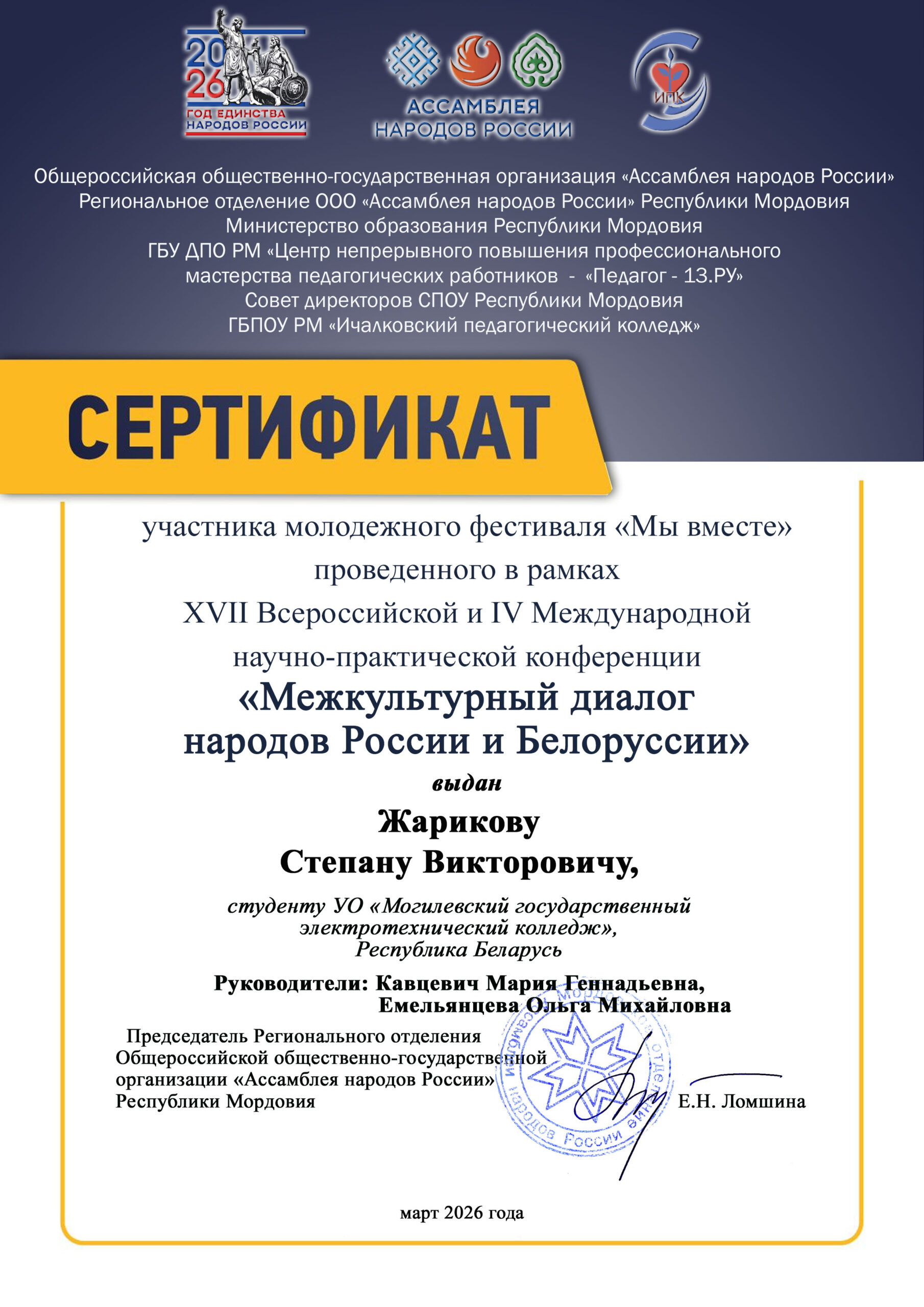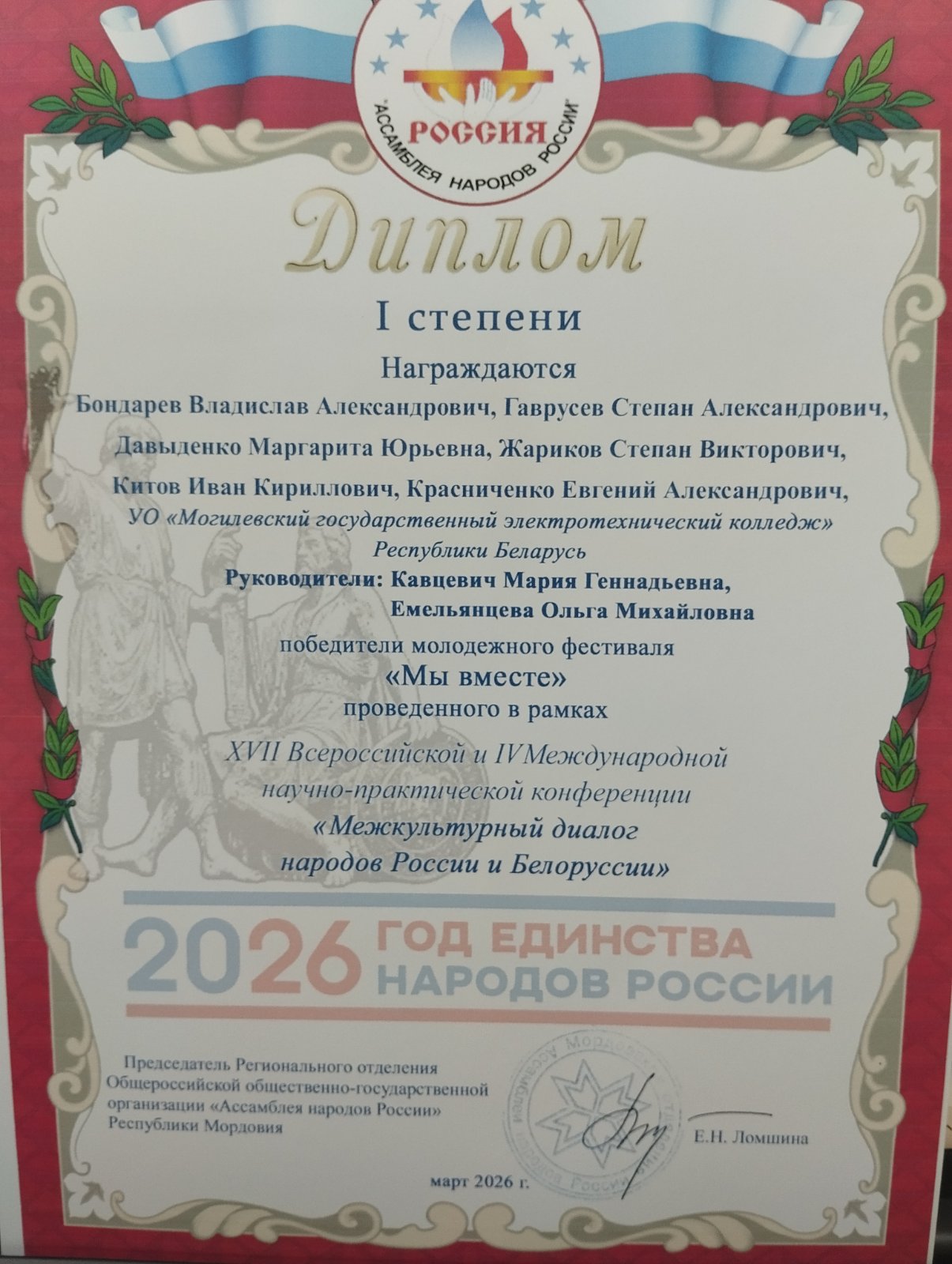 11 марта 2026 года творческая группа колледжа приняла участие в XVII Всероссийской IV Международной научно-практической конференции «Межкультурный диалог народов России и Беларуси» (Российская Федерация, Республика Мордовия).